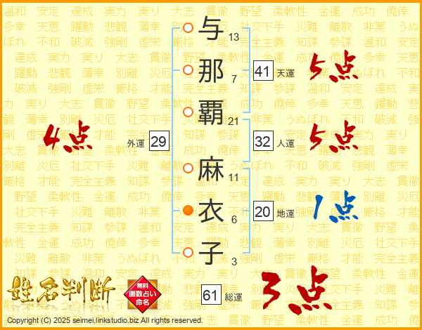 与(13画)那(7画)覇(21画) 麻(11画)衣(6画)子(3画)