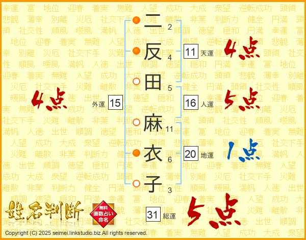 生活面を象徴する運勢です。外部から受ける影響力を表し、結婚運、家庭運や職場、環境への順応性を表します。総運から人運を引いた画数。姓や名が1文字の場合を除く。