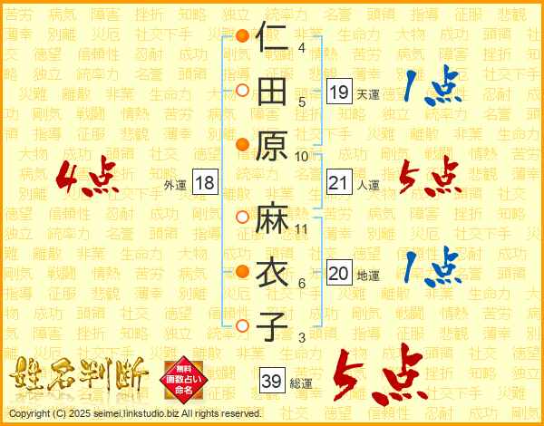 仁(4画)田(5画)原(10画) 麻(11画)衣(6画)子(3画)