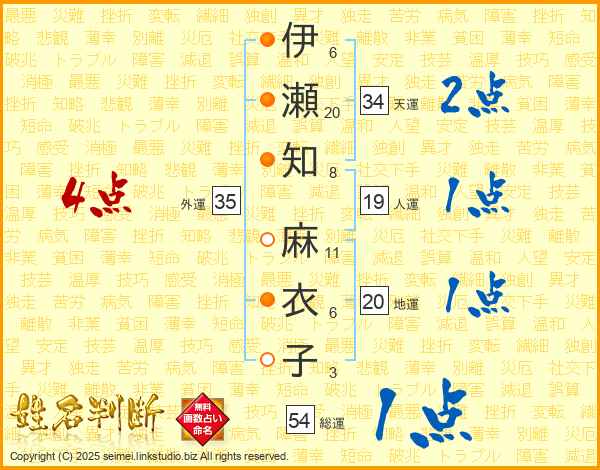 伊(6画)瀬(20画)知(8画) 麻(11画)衣(6画)子(3画)