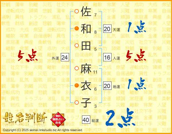 佐(7画)和(8画)田(5画) 麻(11画)衣(6画)子(3画)