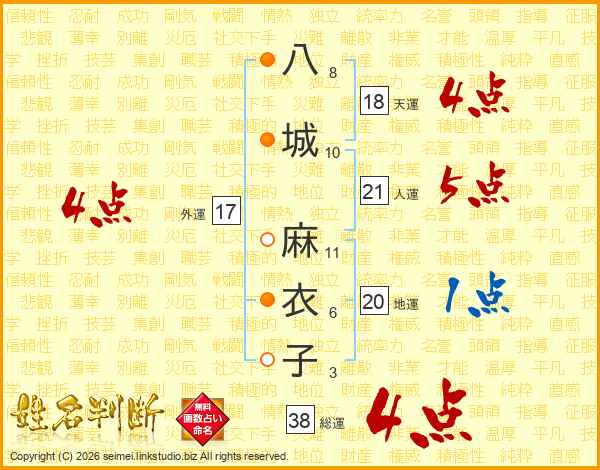 八城麻衣子さんの総運は38画の4点!