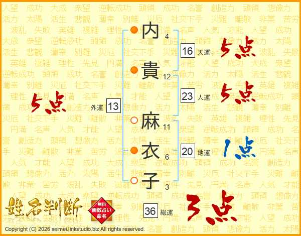 内(4画)貴(12画) 麻(11画)衣(6画)子(3画)