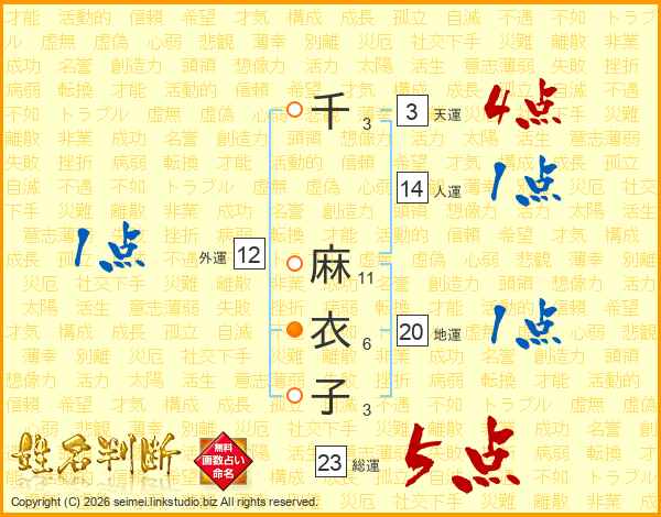 千麻衣子さんの総運は23画の5点!