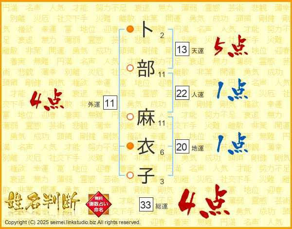 生活面を象徴する運勢です。外部から受ける影響力を表し、結婚運、家庭運や職場、環境への順応性を表します。総運から人運を引いた画数。姓や名が1文字の場合を除く。