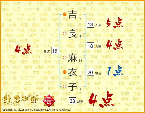 吉(6画)良(7画) 麻(11画)衣(6画)子(3画)