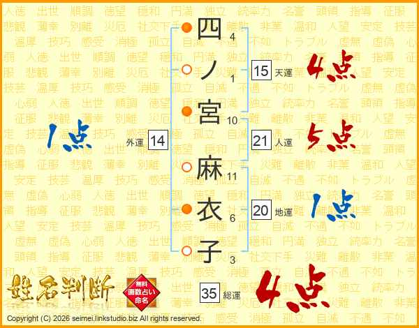 四(4画)ノ(1画)宮(10画) 麻(11画)衣(6画)子(3画)