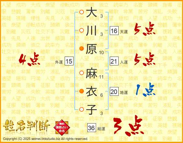 大(3画)川(3画)原(10画) 麻(11画)衣(6画)子(3画)