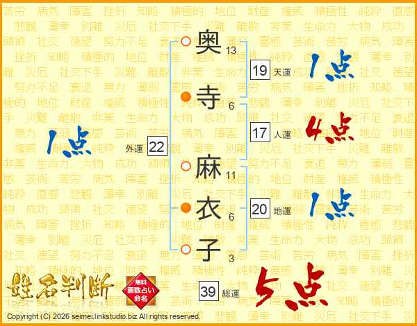 奥寺麻衣子さんの総運は39画の5点!