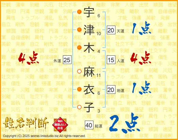 宇(6画)津(10画)木(4画) 麻(11画)衣(6画)子(3画)