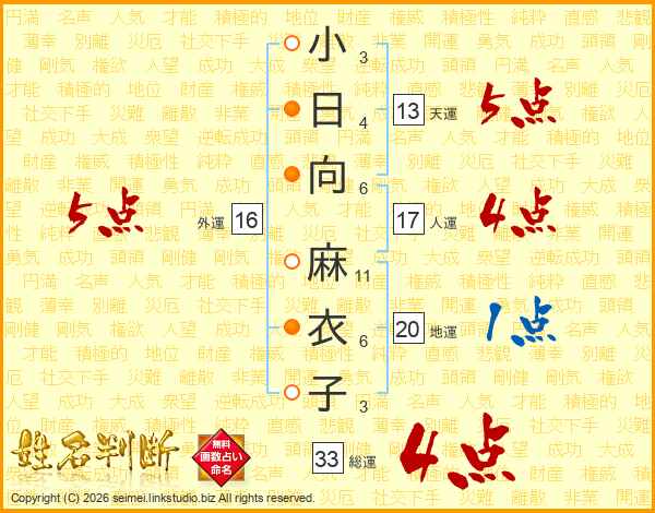 小(3画)日(4画)向(6画) 麻(11画)衣(6画)子(3画)