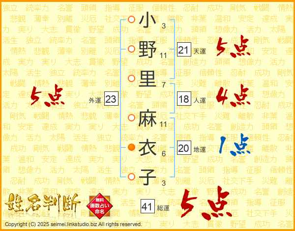 小(3画)野(11画)里(7画) 麻(11画)衣(6画)子(3画)