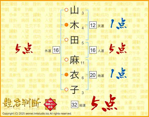 山(3画)木(4画)田(5画) 麻(11画)衣(6画)子(3画)