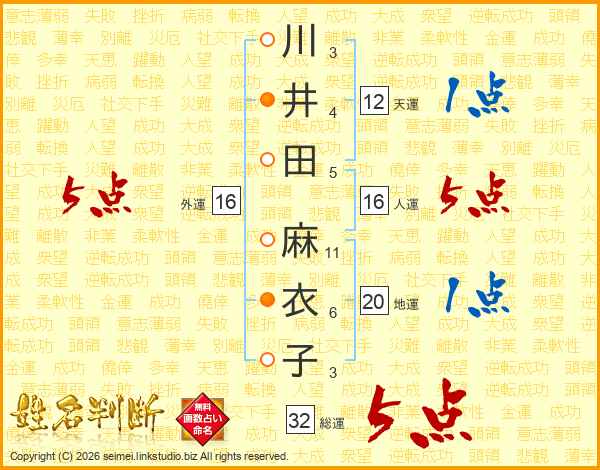 川(3画)井(4画)田(5画) 麻(11画)衣(6画)子(3画)