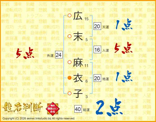 広(15画)末(5画) 麻(11画)衣(6画)子(3画)