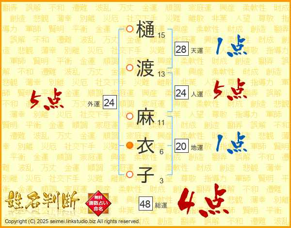 樋(15画)渡(13画) 麻(11画)衣(6画)子(3画)