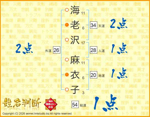 海(11画)老(6画)沢(17画) 麻(11画)衣(6画)子(3画)