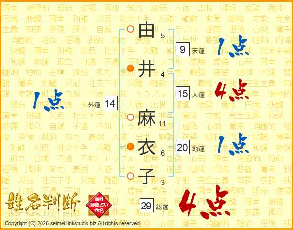 由(5画)井(4画) 麻(11画)衣(6画)子(3画)