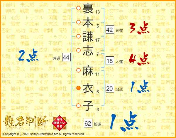 裏本謙志麻衣子さんの総運は62画の1点!