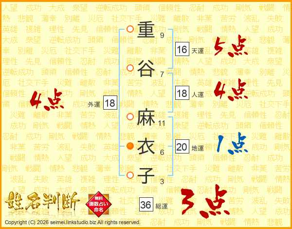 重谷麻衣子さんの総運は36画の3点!
