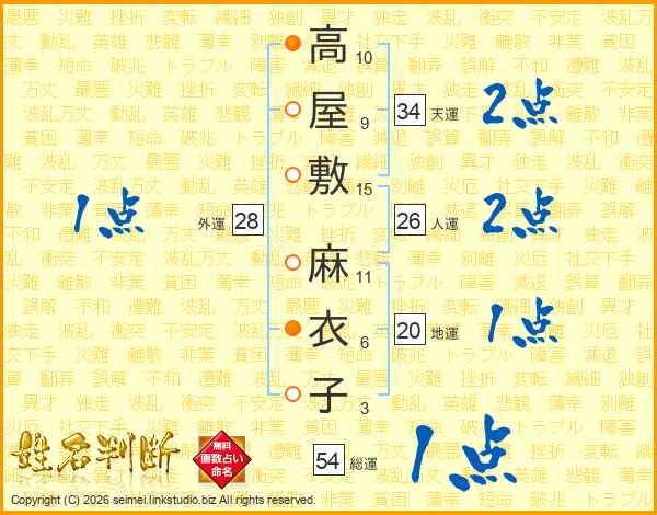 高(10画)屋(9画)敷(15画) 麻(11画)衣(6画)子(3画)