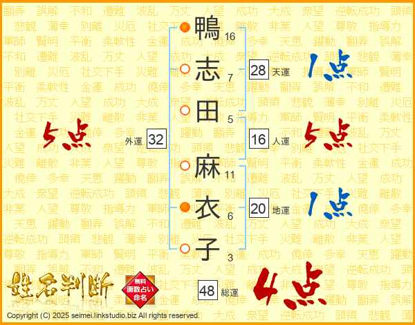 鴨(16画)志(7画)田(5画) 麻(11画)衣(6画)子(3画)