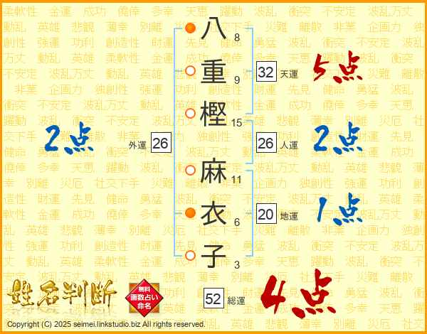 八重樫麻衣子さんの総運は52画の4点