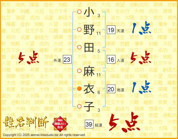 小(3画)野(11画)田(5画) 麻(11画)衣(6画)子(3画)