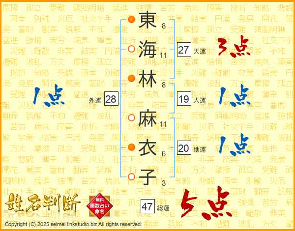 東(8画)海(11画)林(8画) 麻(11画)衣(6画)子(3画)
