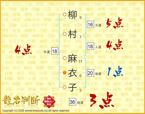 柳(9画)村(7画) 麻(11画)衣(6画)子(3画)