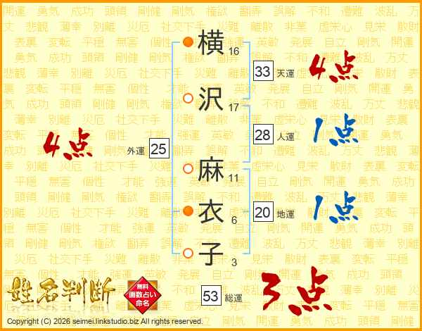 横沢麻衣子さんの天運は33画の4点!