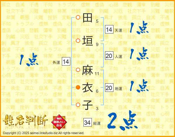 田(5画)垣(9画) 麻(11画)衣(6画)子(3画)