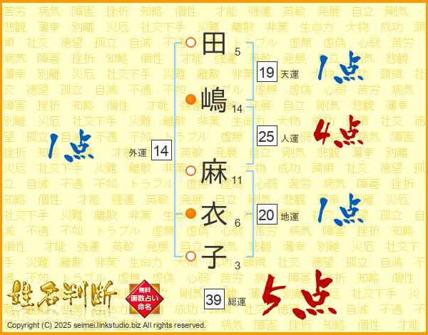 田(5画)嶋(14画)  麻(11画)衣(6画)子(3画)