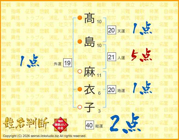 髙(10画)島(10画) 麻(11画)衣(6画)子(3画)