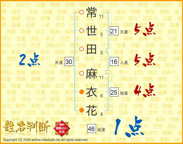 常(11画)世(5画)田(5画) 麻(11画)衣(6画)花(8画)