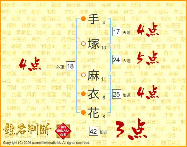 手(4画)塚(13画) 麻(11画)衣(6画)花(8画)