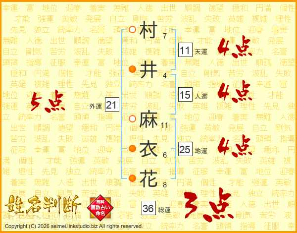 村(7画)井(4画) 麻(11画)衣(6画)花(8画)