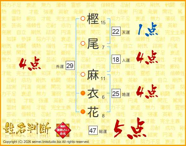 樫(15画)尾(7画) 麻(11画)衣(6画)花(8画)