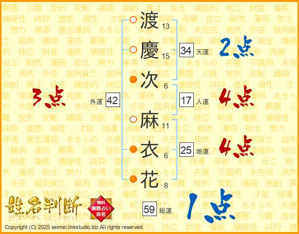 渡(13画)慶(15画)次(6画) 麻(11画)衣(6画)花(8画)