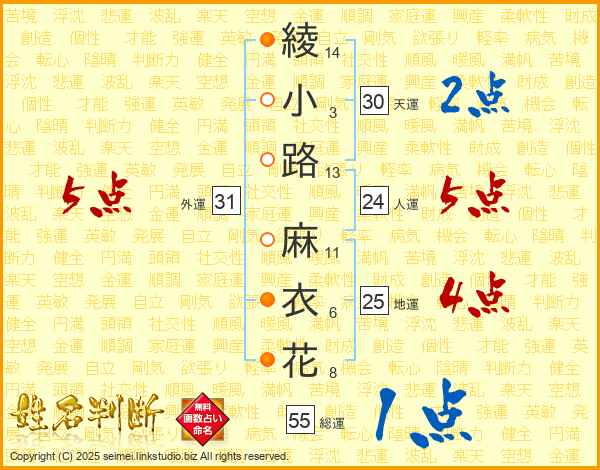 綾小路麻衣花さんの総運は55画の1点!