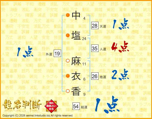 中(4画)塩(24画) 麻(11画)衣(6画)香(9画)