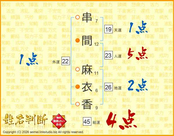 串(7画)間(12画) 麻(11画)衣(6画)香(9画)