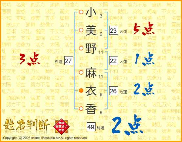 小(3画)美(9画)野(11画) 麻(11画)衣(6画)香(9画)
