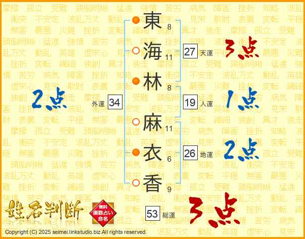 東(8画)海(11画)林(8画) 麻(11画)衣(6画)香(9画)