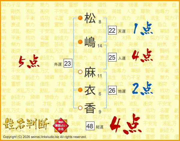 松(8画)嶋(14画) 麻(11画)衣(6画)香(9画)
