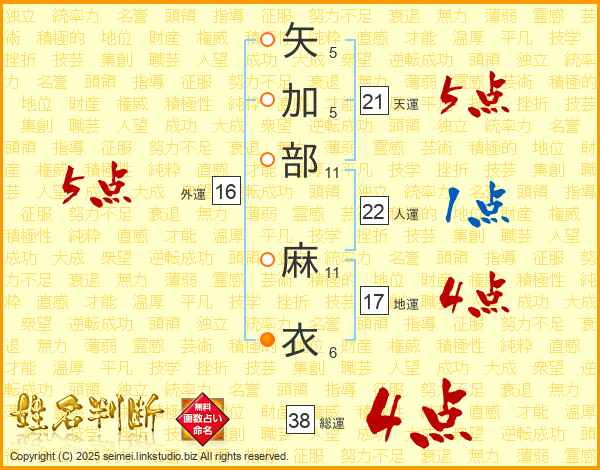 矢加部麻衣さんの総運は38画の4点!