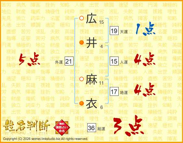 広(15画)井(4画) 麻(11画)衣(6画)