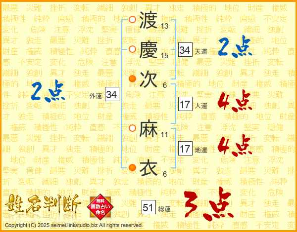 渡(13画)慶(15画)次(6画) 麻(11画)衣(6画)