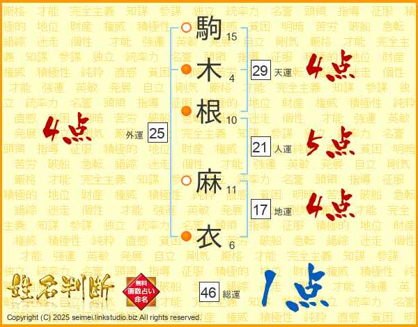 駒(15画)木(4画)根(10画) 麻(11画)衣(6画)