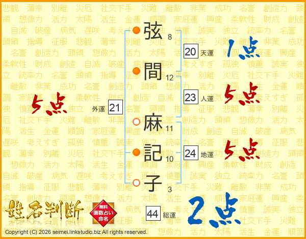 弦(8画)間(12画) 麻(11画)記(10画)子(3画)